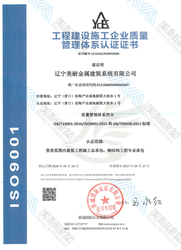 遼寧美耐金屬建筑系統(tǒng)有限公司位于遼寧(營(yíng)口)沿海產(chǎn)業(yè)基地,專注于預(yù)制金屬建筑系統(tǒng)領(lǐng)域,是一家集工業(yè)建筑設(shè)計(jì)、制作、施工及相關(guān)的技術(shù)咨詢與服務(wù)為一體的綜合性服務(wù)企業(yè)。作為國(guó)家鋼結(jié)構(gòu)協(xié)會(huì)會(huì)員、中國(guó)建筑金屬結(jié)構(gòu)協(xié)會(huì)會(huì)員單位與國(guó)家高新技術(shù)企業(yè),美耐建筑集建筑工程施工總承包、鋼結(jié)構(gòu)工程專業(yè)承包等多種資質(zhì)于一身,并擁有22項(xiàng)鋼結(jié)構(gòu)建筑領(lǐng)域?qū)@?項(xiàng)軟件著作權(quán)。
